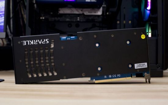 在显卡的背面处,Sparkle(撼与科技)Intel Arc A770 TITAN 16GD6配备了一整块黑色的铝合金背板,其中尾部处上开有多条开槽,显卡工作时的一部分热量可以直接排出。