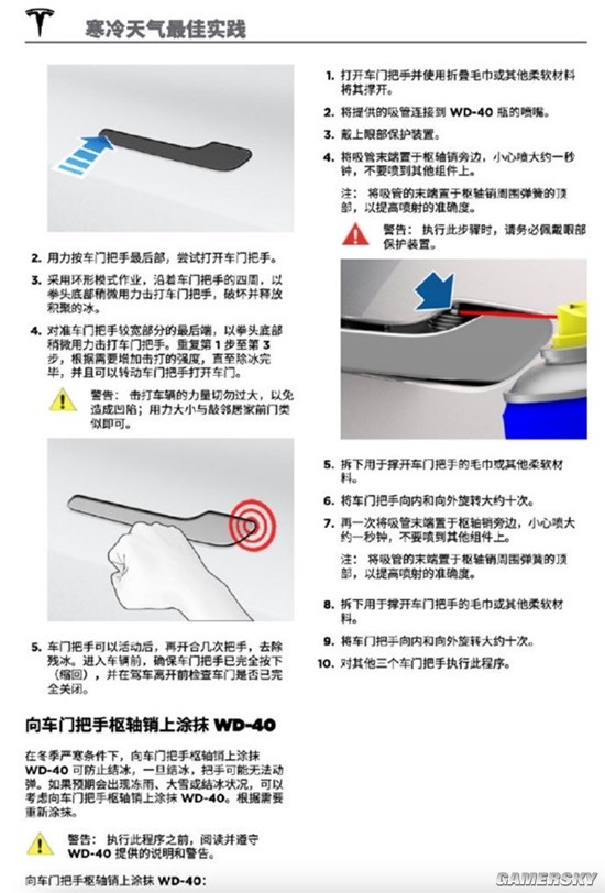 关于如何解决门把手被冻上这件事,特斯拉官方其实也有指导,很简单,就是拿拳头砸:如果遇到车门冻住,建议拳头底部稍微用力敲几下车门把手,便可除冰。
