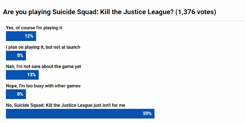 外媒pushsquare发起玩家投票,调查《自杀小队:杀死正义联盟》的参与度表现如何。截至发稿,共1,376人参与投票,其中仅有12%表示正在体验这款新作,8%表示有打算尝试一下,近60%玩家表示对游戏并不感兴趣。总体来看,这款略带争议的线上服务型游戏显然还有很长的一段路要走。