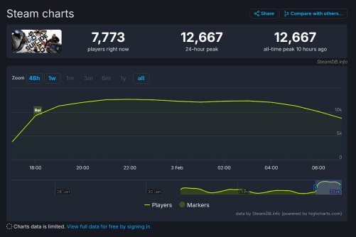 然而,根据SteamDB页面显示,这款曾经开发过《蝙蝠侠》系列的开发商Rocksteady开发了多年的3A游戏在发布后,同时在线玩家峰值仅有12667人。
