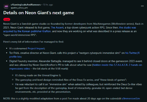 Neon Giant创意总监Tor Frick的推特个人简介将其描述为“次世代赛博朋克沉浸式模拟游戏”