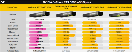 RTX 3050 6GB改成了最小的GA107核心,编号为GA107-325,只有2304个CUDA核心、64个张量核心、16个光追单元、64个纹理单元,只保留了20个ROP单元。