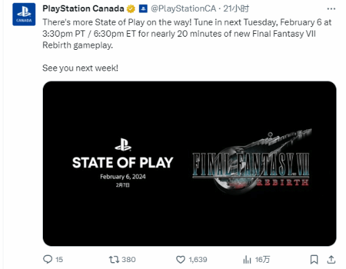 今日,PlayStation加拿大官推确认了《最终幻想7:重生》专场State of Play发布会的具体时间等细节。