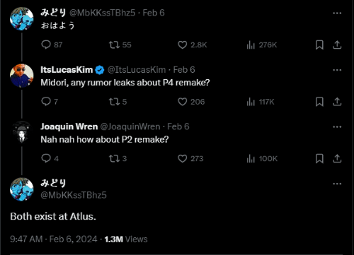 根据知名泄密者@MbKKssTBhz5的说法,《女神异闻录2》和《女神异闻录4》的重制版“都存在于Atlus”。