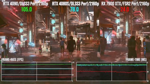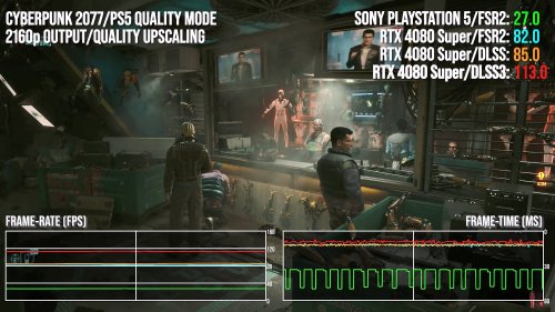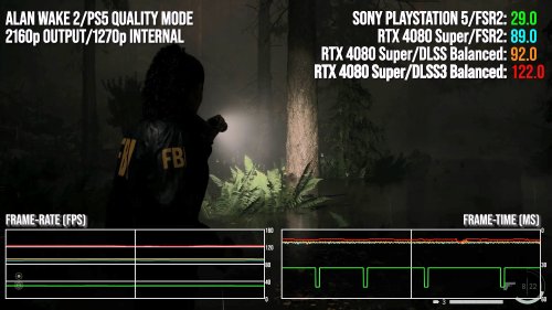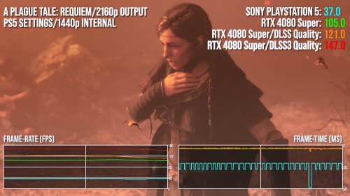 数毛社主要对《瘟疫传说:安魂曲》《赛博朋克2077》《心灵杀手2》三款游戏进行了测试,测试发现在完全相同的画面设置和分辨率下,RTX 4080 Super的速度要比PS5快2.8-3.2倍,如果使用DLSS和帧生成技术,差距将进一步扩大。凸显了游戏机和 PC高端硬件之间的巨大差距。