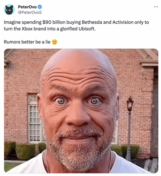 今日,博主PeterOvo再次发文吐槽Xbox第一方登陆PS的消息:想象一下,微软花费900亿美元收购Bethesda和动视暴雪,只是为了将Xbox品牌变成光荣的育碧,传言最好是假的。