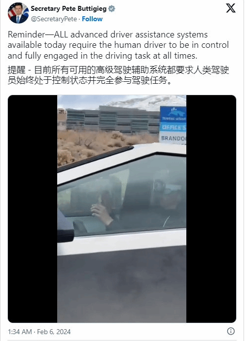 美国交通部长皮特?布蒂吉格(Pete Buttigieg)近日在社交媒体上发出警告,提醒驾驶员切勿在开车时使用虚拟现实(VR)头显。起因是一段在网络上疯传的视频,画面显示一名特斯拉Cybertruck司机疑似戴着苹果公司新发售的Vision Pro头显,双手在空中比划,似乎在操控虚拟现实界面。对此,布蒂吉格在推特上评论道:“所有当前的辅助驾驶系统,都要求驾驶员保持专注,随时准备接管车辆控制。”