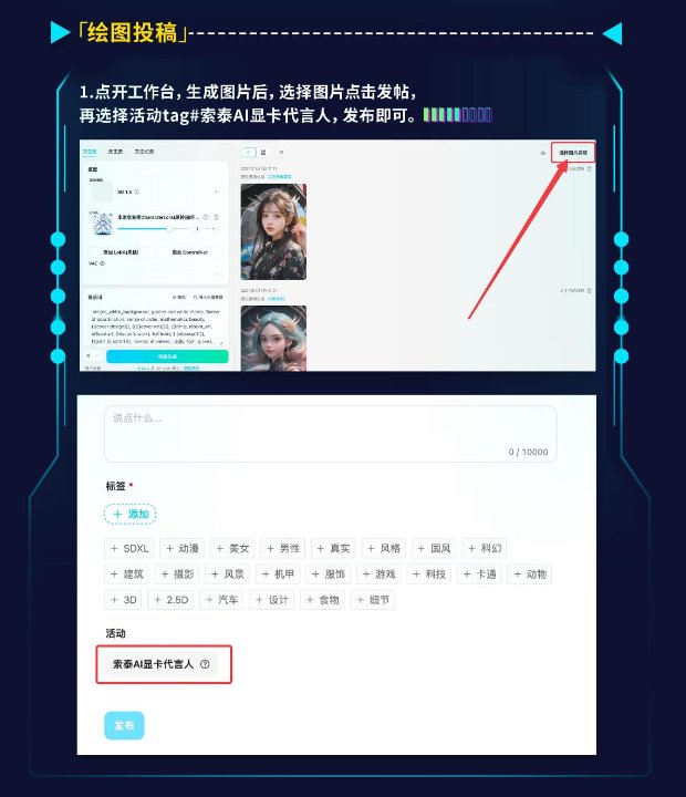 为推动AI在艺术与设计领域的发展,索泰与国内头部AI艺术模型分享社区和在线运行平台吐司tusiart.com 联合发起“索泰显卡AI创作大赛”。参赛者使用吐司tusiart提供的在线AI运行平台,创作新的索泰品牌形象代言人“阿索”模型,或根据索泰IP形象“天启姬”和“莉达”进行创意绘图,投稿日期截止2月23日。