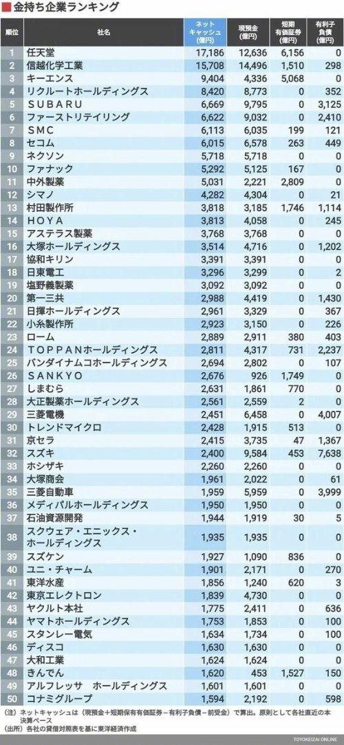 据日媒Toyokeizai报道,任天堂在日本所有上市企业中拥有最高的净现金,约为1.7兆日元(约合人民币835亿元),排名第二的是信越化学工业,其净现金约为1.5兆日元(约合人民币763亿元),而第三名基恩士的净现金约为9404亿日元(约合人民币457亿元)。