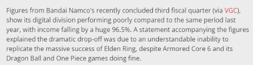 声明中指出,虽然新作《装甲核心6》很受欢迎,且《龙珠》《海贼王》系列在日本和海外的销量也很稳定,但难以复制上一财年《艾尔登法环》取得的巨大成功,所以收入大幅下降是可以理解的。