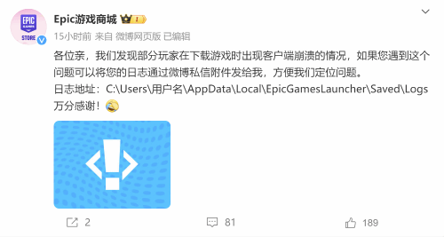 近日Epic游戏商城在微博上发文称,目前有部分玩家在使用Epic商城客户端下载游戏时出现崩溃现象,官方正在定位问题。