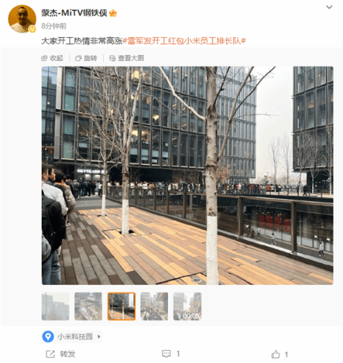 从照片来看,超多小米员工在小米科技园排起了长队,等待领取红包,开工热情高涨。