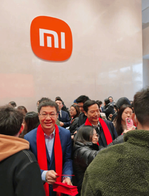在红包派发现场,小米CEO雷军、小米品牌总经理卢伟冰等高管戴上了喜庆的红围巾,面带微笑为每一位小米员工送上开工红包。