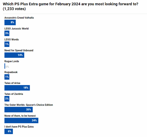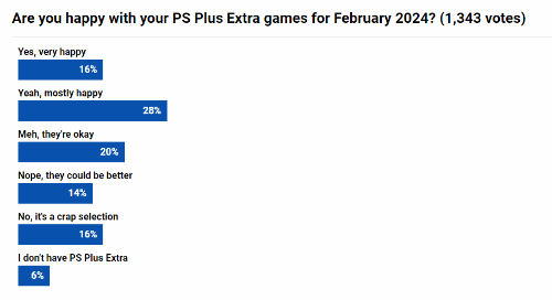 外媒Push Square发起投票活动,调查玩家对本月新增游戏的满意程度。截至发稿,共1343名玩家参与了投票,其中16%表示对新增游戏非常满意,28%表示认可大部分游戏的质量;20%表示质量尚可;14%的玩家则认为质量有待进一步提高,最后16%认为新阵容相当糟糕。