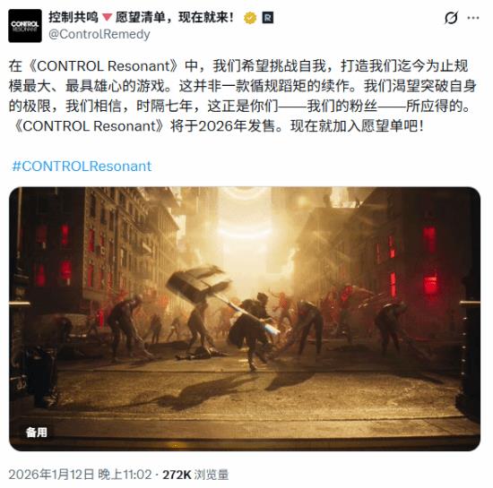 1月12日,官方推特发文表示:“在《控制:共鸣》中,我们希望挑战自我,打造我们迄今为止规模最大、最具雄心的游戏。这并非一款循规蹈矩的续作。我们渴望突破自身的极限,我们相信,时隔七年,这正是你们——我们的粉丝——所应得的。”