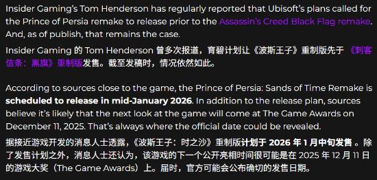 值得一提的是,知名消息人士、Insider Gaming主编Tom Henderson曾爆料称,《波斯王子:时之砂重制版》将于2026年1月中旬发售,而《刺客信条:黑旗 重制版》将晚于《波斯王子:时之砂重制版》推出。