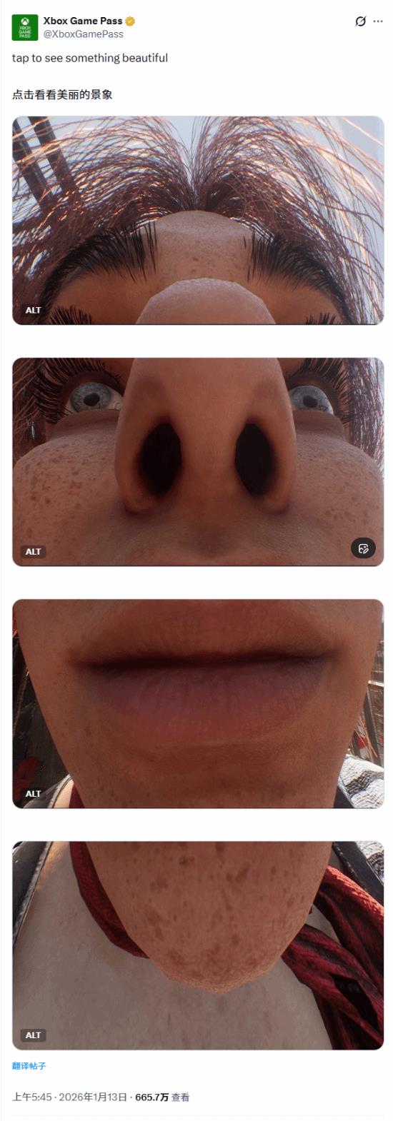 1月13日,Xbox Game Pass的官方账号发了个有趣的宣传,写着“点击看看美丽的景象”,结果点进去是《光与影:33号远征队》女主的超级特写。