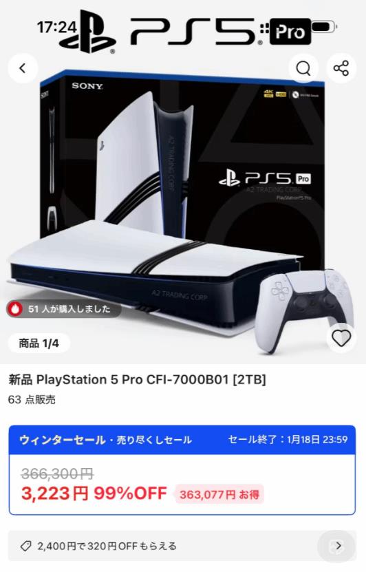 他晒出的截图显示,这台正在参与“冬季清仓大甩卖”的PS5 PRO,标价竟高达366,300日元(约合人民币1.6万元),更令人惊讶的是,商品曾给出99%的折扣。最终,该网友的结算价格仅为3,073日元(约合人民币134元)。