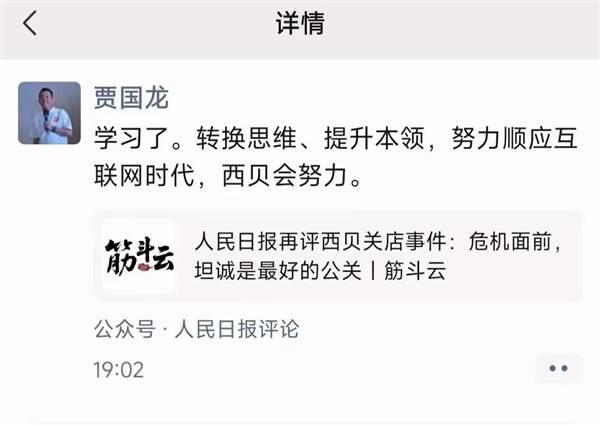 贾国龙也是第一时间在朋友圈回应称,“学习了,转换思维、提升本领,努力顺应互联网时代,西贝会努力。”