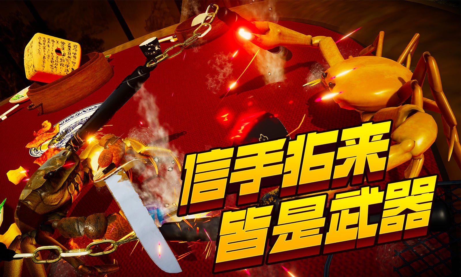 《蟹王争霸》是一款3D格斗类动作游戏。在一个平行世界,神明赋予了螃蟹无与伦比的智慧和力量,于是,螃蟹抢走了人类的武器,支配了大地。在这里,螃蟹是不死之身,枪和刀都不能杀死。但是,这个世界有一个至高无上的甲壳法则背着大地的一方就是败者!没错,在战斗中被扳倒的就要服从认输。这不仅是沙雕游戏,也是新时代的格斗游戏。传统的格斗游戏仅限于预先制作的动画,但本作品中的角色会贯彻反映玩家的操作,提供更逼真令人信服的战斗体验和意想不到的事件。为了简化躯干的物理使用投技,在选用螃蟹角色也是有此原因。除了攻击之外,抓紧、投掷、使用工具等所有动作都是交互设计,全力将敌人反倒的手段。所以,战斗吧!拿起武器,以最强的螃蟹为目标,胜者蟹王败者鳌锅!