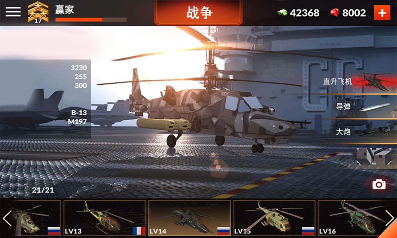 在这款PVP动作游戏中,你可以操控火力强大的武装直升机。游戏里有20多种战斗直升机,装备各种武器和设备等,定制程度极高,可选择装配机关枪、导弹、热收集器、伪装及贴花类型。逼真的3D画面,给你带来难以忘记的飞行体验!★游戏特色★- 实时多玩家PVP连续战斗;- 逼真的3D画面和震撼的视觉效果;- 5个独一无二的世界大战地点;- 22种战鹰可供驾驶;-大量的装备和酷炫的伪装;- AI练习实战的奖励生存模式;- 支持倾斜振动控制。