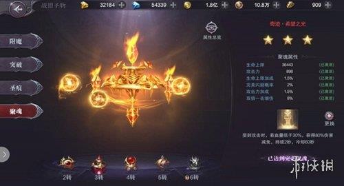 聚魂属性提供固定基础加成和攻击特效加成,提升效果巨大,但获取难度较高。需要战盟商店等级较高才能获取相关材料。因此,玩家需要加入一个排名靠前且等级较高的战盟,以便进行圣物聚魂提升。
