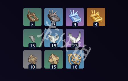 奇巧秘器的残件×3、奇巧秘器的模本×9、奇巧秘器的继业×9、奇巧秘器的真愿×4、霜夜的残照×15、霜夜的柔辉×18、霜夜的煌荣×27、磨损的执凭×10、精致的执凭×15、霜镌的执凭×18