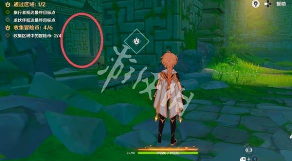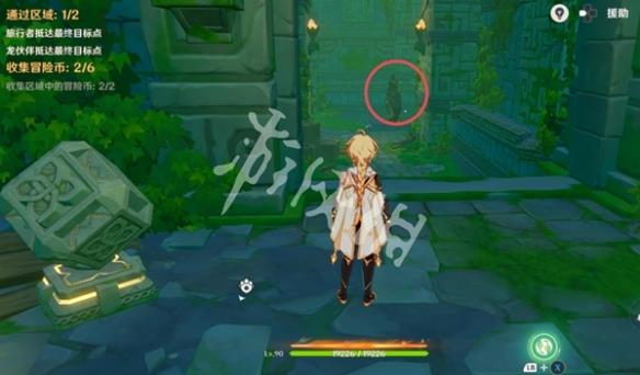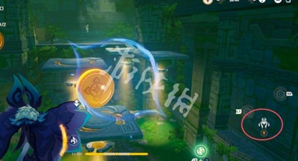 10、紧接着视角切换瞑视龙;移动到旅行者旁边,此处长按跳跃键即可高高跃起;利用这一能力拾取金币,并在金币的位置转动视角。
