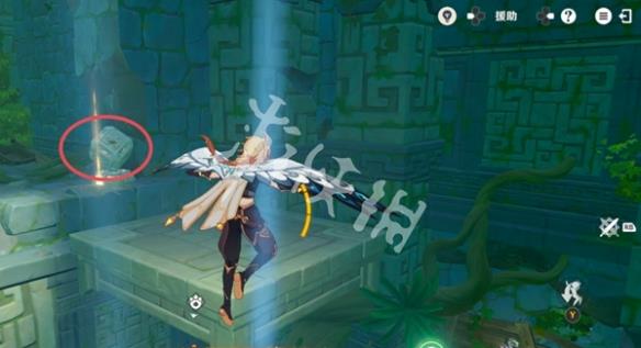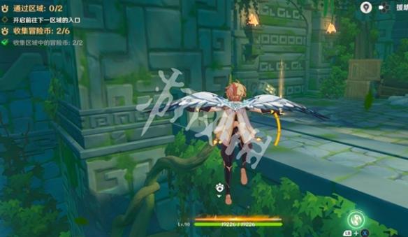 18、随后视角切换旅行者,点按两次跳跃键打开风之翼,并往机关的方向飞。