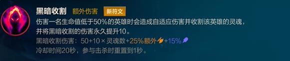 伤害一名生命值低于50%的英雄时会造成自适应伤害并收割该英雄的灵魂,并将黑暗收割的伤害永久提升10。