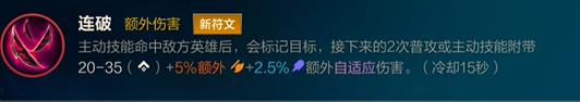 主动技能命中敌方英雄后,会标记目标,接下来的2次普攻或主动技能附带(20~35 5%额外攻击力 2.5%法术强度)额外自适应伤害。(冷却时间15秒)
