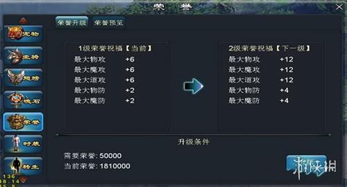 人物到达56级后,开放荣誉系统。荣誉可以增加人物属性最大值,升级需要消耗一定量的荣誉点。荣誉点可以通过城主膜拜、日常任务及VIP福利获得,也可以在商城购买荣誉符使用获得。