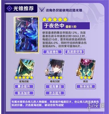 光锥【于夜色中】:该光锥可以为希儿提升暴击率,并依据希儿速度值超过100的部分,为希儿的普攻和战技提供增伤效果,为终结技提供暴击伤害加成,它十分利好高速度的希儿,是希儿光锥的最优选择。