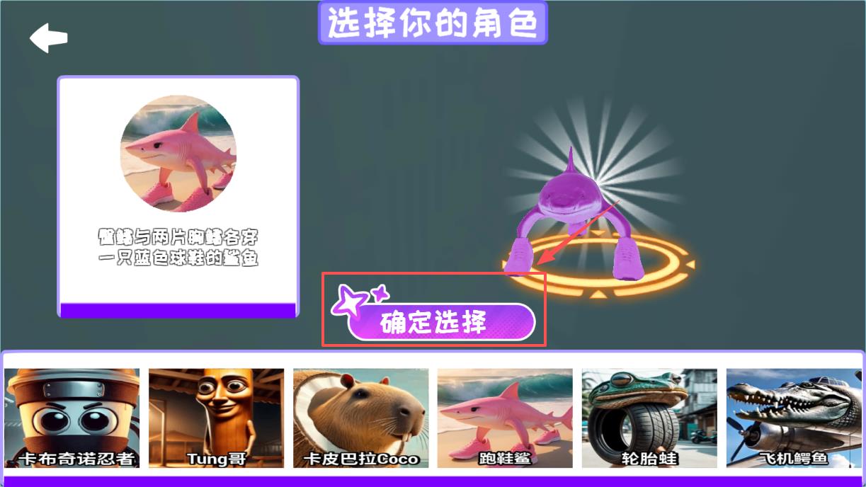 3、进入角色选择界面时,你会看到很多独特角色,比如跑鞋鲨或卡皮巴拉,滑动下方图标可以预览,点击确定选择就能锁定。