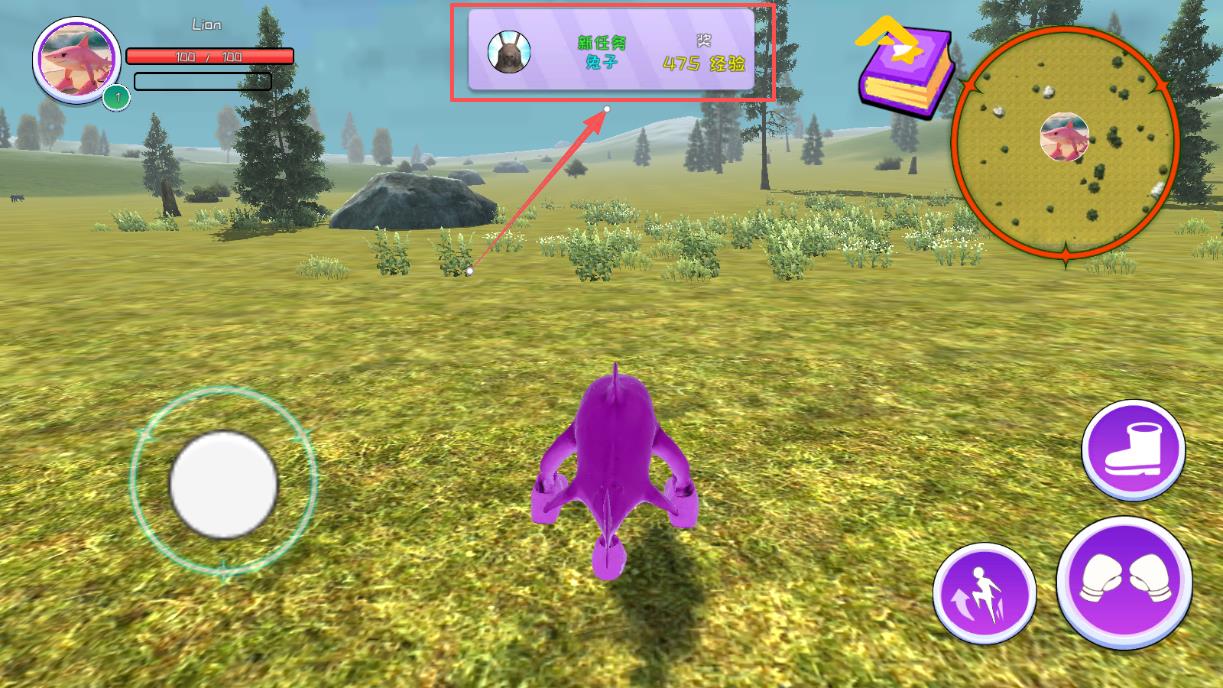4、游戏开始后,注意屏幕中间的任务提示,比如追捕兔子能获得经验。使用左下角的摇杆控制移动,右侧紫色按钮负责跳跃和攻击。