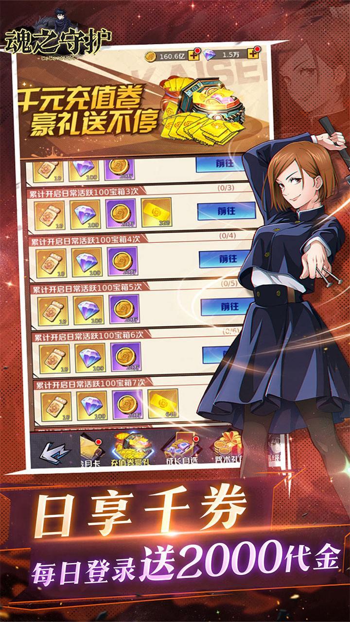 本期小编给大家介绍一下《魂之守护》0.1折送2k代金券这款游戏,它是个根据超人气动漫《咒术回战》IP打造的竖版卡牌策略手游,游戏把原作的世界观还原得挺到位,能让人沉浸式去体验那种咒术战斗,大家在玩的时候可以去把虎杖悠仁还有五条悟以及伏黑惠这些高人气角色都收集起来,自己去搭配组建一个最强的咒术小队,而且这游戏的福利也相当可以,只要签到就会给充值券,连核心的UR卡牌五条悟·涩谷都直接送,平时做做日常活跃任务还能拿到千元代金券,大家完全可以借着这些福利去开启自己的咒术巅峰之战。