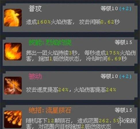 加点:绝招「流星陨石」必须加至 15 级,三阶效果可提升全属性加成;技能「烈焰灼烧」升至 15 级,强化群体清怪效率;被动技能优先升至 10 级,提升火焰伤害;普攻保持 5 - 10 级,以节省资源。