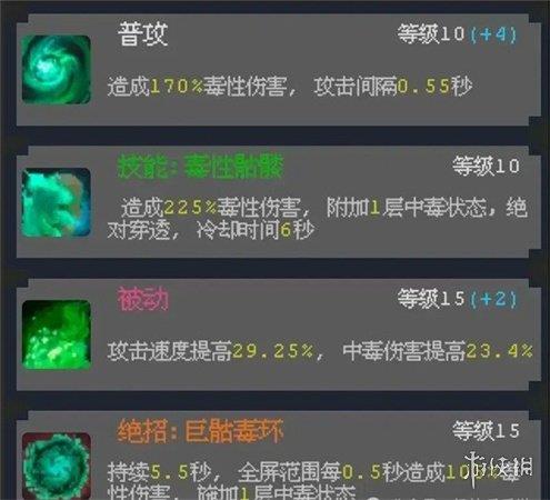 加点:绝招「巨骷毒环」必须加至 15 级,可造成全屏持续伤害,技能升至 10 级,补充中毒层数;被动技能优先升至 15 级,提升中毒伤害。
