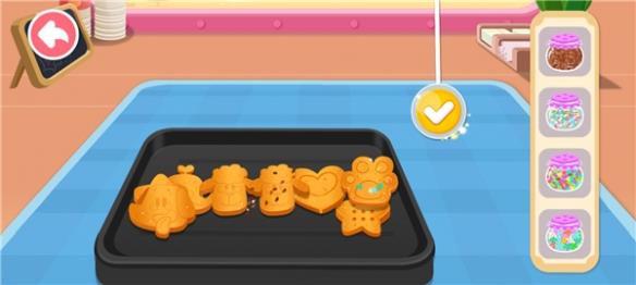 这是游戏的核心启蒙玩法,内置16种热门甜品,涵盖姜饼屋、彩虹拉丝吐司、奶油蛋糕、彩虹冰棒、动物手工糖等,每种甜品都有专属的制作步骤。小朋友可进入甜品制作区,自由选择想要制作的甜品,按照语音引导和画面提示,一步步完成制作:制作姜饼屋时,先混合黄油、面粉制作面饼,用模具压出造型,放入烤箱烘烤,再用蛋白糖霜拼接、装饰;制作彩虹拉丝吐司时,将芝士染色、撒在吐司上,煎至金黄即可拉出彩虹芝士;制作动物手工糖时,将糖稀染色、倒入模具塑形,再贴上五官贴纸设计表情,全程动手操作,充分锻炼孩子的手部精细动作与动手能力,同时认知各类食材与制作工具。