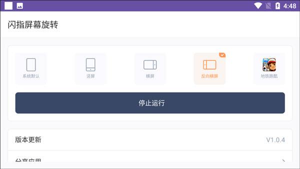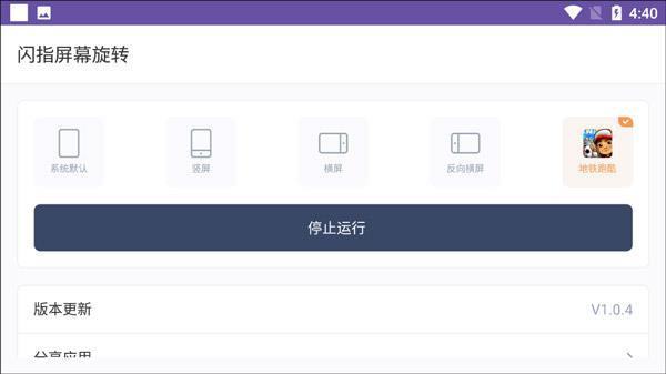 5、想要关闭横屏也很简单,返回到闪指屏幕旋转软件,点击停止运行即可关闭