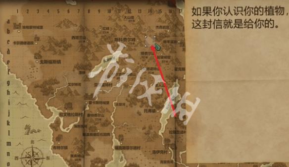 2、信件任务:使用特殊的镜子,面朝博菲尔山北边,位于埃斯科河的源头(C14),获得1种新植物。