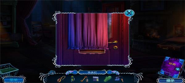 11、拿走书柜上的开锁器和木板,拿走右边圆桌上的特殊眼镜,可以查看蓝色迷雾;