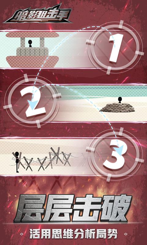 《暗影狙击》是一款全新迷你卡通风格的火柴人动作狙击射击类游戏。因为是采用了火柴人风格,虽然画面乍一看会让人觉得简陋,但是动作的精度和细节刻画都非常到位,特别是狙击时人物的动作和反应。玩家在游戏中化身为暗影职业杀手,需要在各种天气和各种场景下对于任务目标的人物进行射击,及时性的调整好狙击镜,瞄准你的敌人(每一局的任务目标),对他进行致命攻击,你只有一次攻击的机会,不要因为大意而放跑了你的敌人(最终目标)。游戏的玩法上,也主要围绕射击距离、风向,场景变化和人物行动来进行关卡设计。有些关卡也设计更像解谜游戏,因为玩家需要仔细阅读任务信息才能知道怎样是正确的行动。