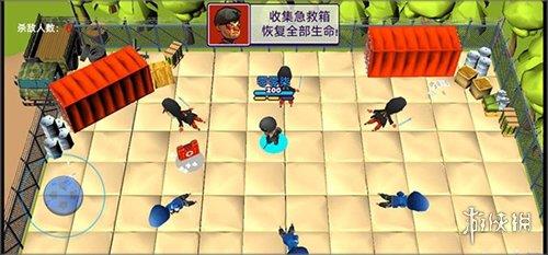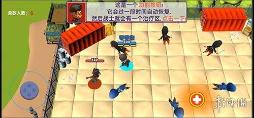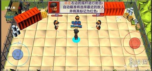 2、点击右边的摇杆进行射击,自动瞄准最近的敌人并标记为红色。