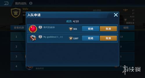 当战队类型设置为需要批准才能加入时,在入队申请列表中可以看到申请加入战队的人员信息。只有指挥官和副指挥官有权限进行入队审批。管理者可以根据申请者的实力和等级,决定是否同意其入队。