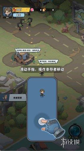 1、通过滑动手指操作幸存者移动,优先前往安全区域救援队友、搜集物资。