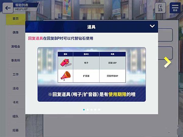 还有就是使用小喇叭和哨子,小喇叭可以回复10个BP每次,哨子可以回复1个BP每次,这个道具就比较好了,哨子可以在充值页面充值应援月卡每日可以获得5个。