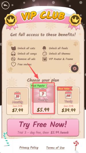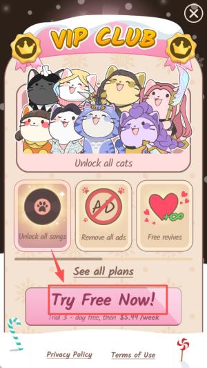 popcat音乐世界游戏VIP 与操作教程指引1、“VIP CLUB” 界面展示解锁猫咪、歌曲等权益,设有 “Try Free Now!” 按钮,提供 3 天免费试用后按周订阅的方案。
