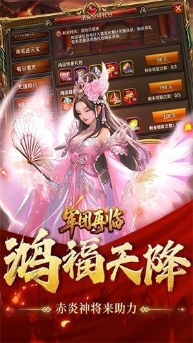 玩法多元丰富,涵盖国战、军团战、跨服战等热血对抗玩法,以及武将招募、骑宠幻化、神兵锻造等养成玩法,兼顾热血与休闲;上线即送永久折扣、新手大礼包、充值卡等福利,助力玩家轻松度过新手阶段,无强制氪金套路,适配各类玩家需求。