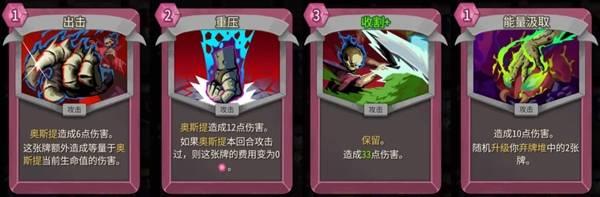 【取回】本身一回合一次的0费抽一,相当于白嫖伤害,同时可以帮助触发【重压】【紧追不放】【猛晃】【榨取】之类的牌的附加效果,属于前期可以无脑带一张,中后期没配合上也不亏,配合上就血赚的牌。【重压 】则是朴实无华的0费打16,除了初始牌组中的【出击】以外还有一张奥斯提攻击牌,就可以拿了,拿完可以再适当补点别的奥斯提攻击牌。